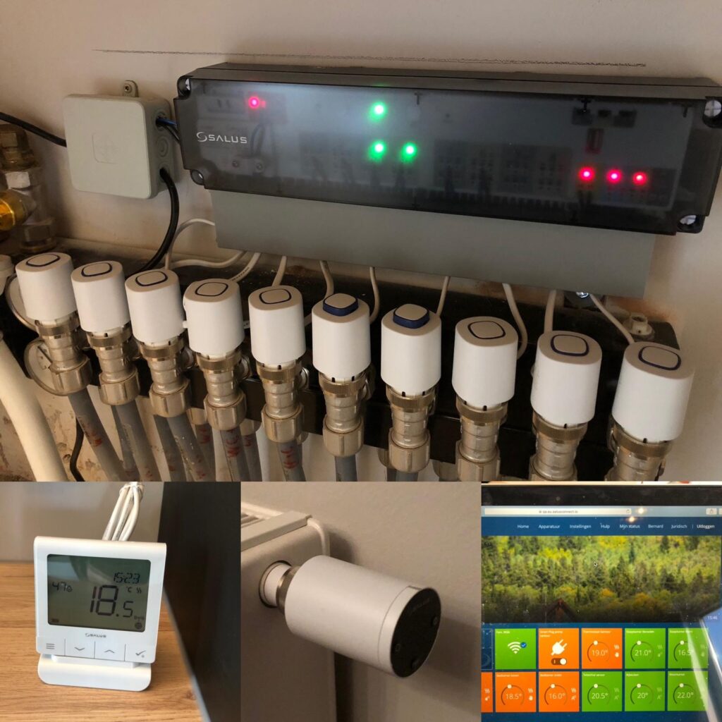 Een Salus Systeem bij onze klant waarbij zichtbaar is dat de groepen 6 en 7 warmtevraag hebben. Doordat de Actuator omhoog staat kan men zien dat de actuator op de draadloze klemstrook KL08RF reageert. Tevens is er in een ruimte met radiator een TRV radiatorknop geplaatst. De temperatuur van de TRV wordt geregeld via de gekoppelde thermostaat, waardoor deze reageert op de temperatuur gemeten bij de thermostaat en niet bij de radiator zelf. Alles is via de App te monitoren en in te stellen.