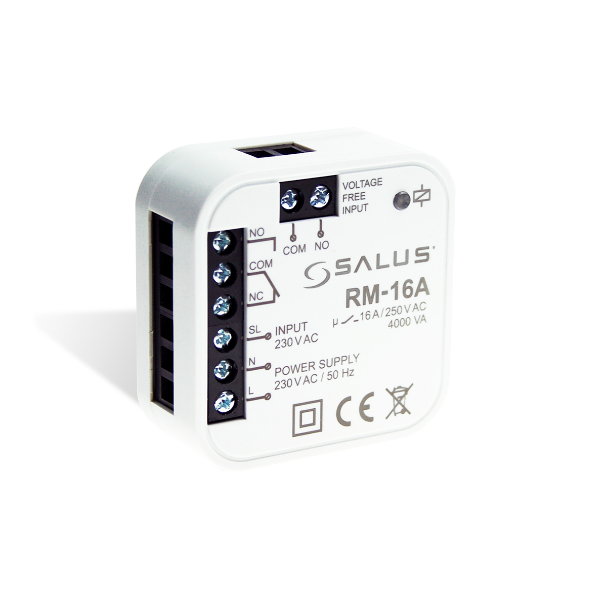 Het RM16A Relais opent en sluit stroomcircuits van max 16A op vraag van de aangesloten apparaten. Ideaal bij gebruikt van elektrische verwarming en andere elektrische apparaten.